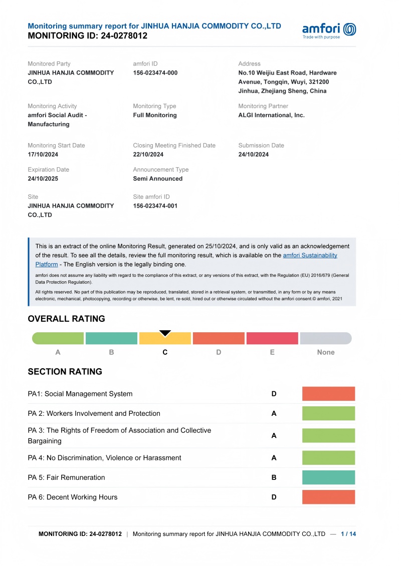 I mí Iúil 2025,Jinhua Hanjia Commody Co., Ltd.Fuair sé deimhniú C-leibhéal go rathúil sa Chlár Iniúchta Monarcha um Aicmiú Idirnáisiúnta um Chaighdeáin (ICS), arna stiúradh ag an nGníomhaireacht Cigireachta Eorpach tríú páirtí arna gceapadh ag Cooperative Union Enseigne. Cuimsíonn an córas deimhniúcháin seo ceithre shraith: A, B, C, agus D. Mar bhall de Chumann Tráchtála agus Tionscail na Fraince (FCD), cloíonn an chuideachta le scéim bainistíochta sóisialta na hEagraíochta Saothair Idirnáisiúnta SA8000, Clúdaíonn an scóip iniúchóireachta, lena n -áirítear cearta daonna, sláinte agus sábháilteacht cheirde, coinníollacha monarcha, pá, agus comhlíontacht do cháipéisí.