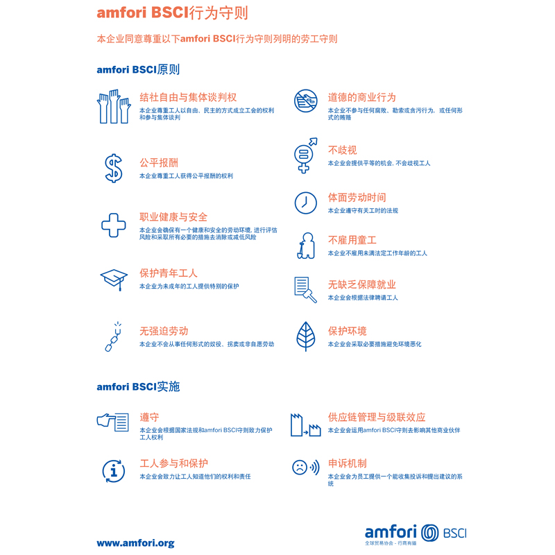 De réir riachtanais rialacháin BSCI, cloífidh ár gcuideachta go docht leis na treoirlínte saothair atá leagtha amach i gCód Iompraíochta Amfori BSCI chun cur i bhfeidhm éifeachtach phrionsabail BSCI a chinntiú. Le linn an phróisis táirgthe, tá meas againn ar chearta oibrithe chun ceardchumainn a bhunú ar bhealach saor agus daonlathach agus páirt a ghlacadh i gcómhargáil.Geallaimid freisin do neamh-idirdhealú, a chinntiú go bhfaigheann oibrithe fostaithe cúiteamh agus cleachtais saothair cothroma. Ina theannta sin, ráthaímid go bhfuil uaireanta oibre réasúnta agus cearta bunúsacha eile ag oibrithe.
